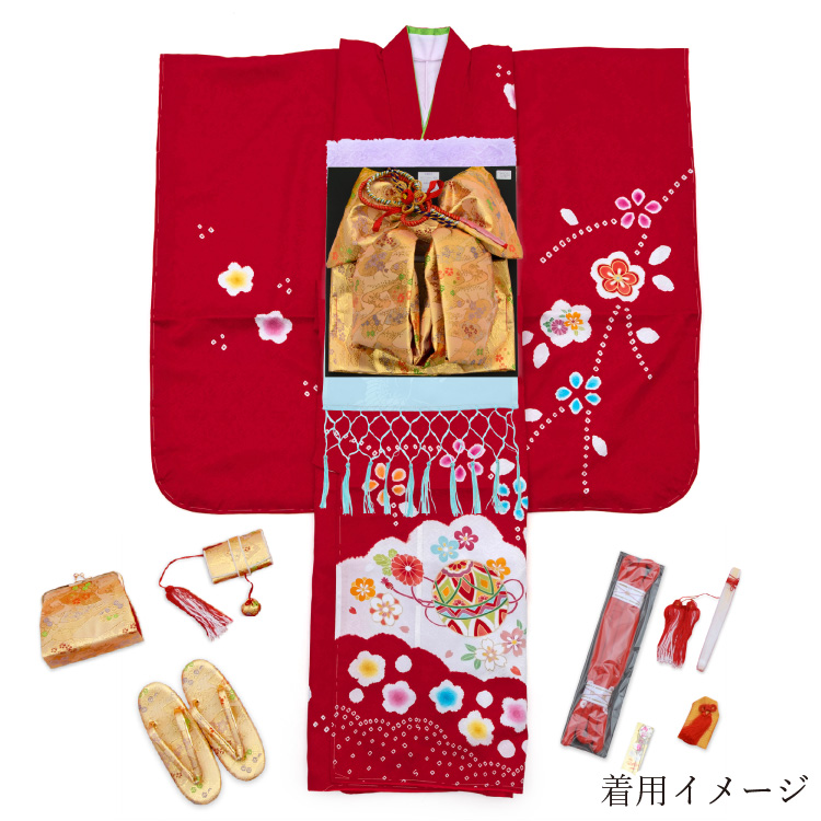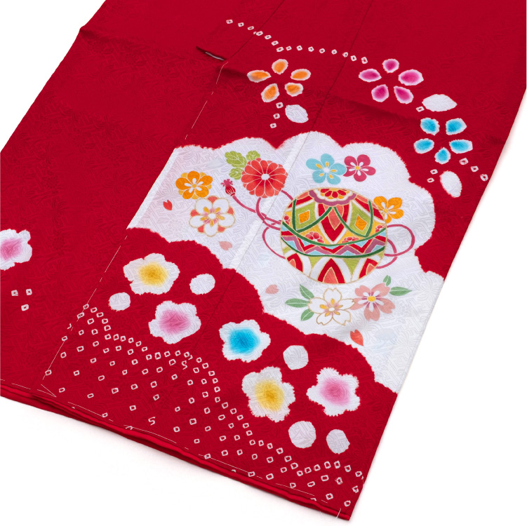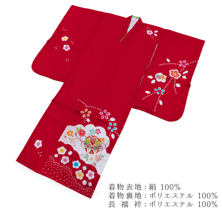 商品説明 | 着物・重ね衿・長襦袢が付いたセットです。 正絹の赤色のお着物です。 柄には毬や桜などが描かれています。 御祝着に最適な賑やかな柄になります。 |